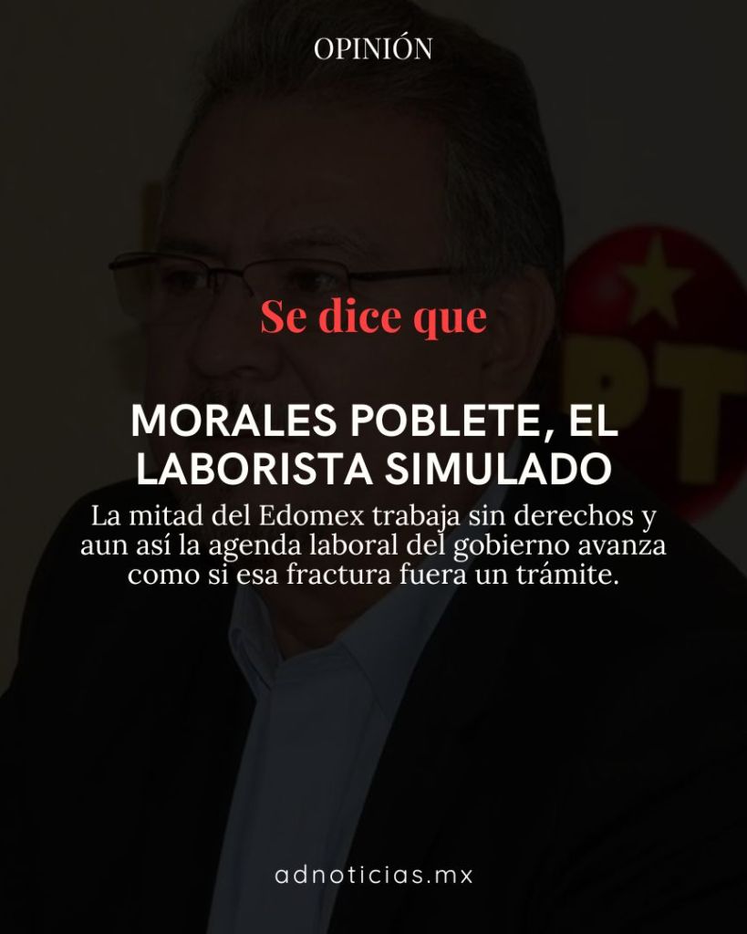 La mitad del Estado de México trabaja sin derechos y, aun así, la agenda laboral del gobierno avanza como si esa fractura fuera un trámite: 4.5 millones de personas sobreviven en la informalidad, un sistema funcional para patrones que reducen costos, municipios que maquillan empleo y operadores que administran vulnerabilidad como capital político. En ese vacío, aparece Norberto Morales Poblete, figura del PT que presume bandera obrera mientras tolera inercias que reproducen el mismo modelo. Su omisión pesa porque la transformación laboral exige confrontar intereses y desmontar la normalización de la precariedad. Y, aquí, nada de eso ocurre. Callar frente a 4.5 millones en la sombra no es prudencia: es simulación. En política laboral, simular es tomar partido.