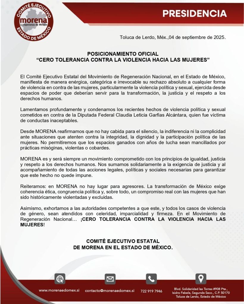 El Comité Ejecutivo Estatal de Morena en el Estado de México manifestó a través de un comunicado su rechazo absoluto a toda forma de violencia contra las mujeres, en particular la política y sexual. Condenó los hechos recientes en agravio de la diputada federal Claudia Leticia Garfias Alcántara y exigió justicia pronta y firme.