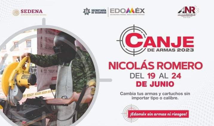 En cabal cumplimiento a su compromiso de contribuir a la consolidación de la paz social en Nicolás Romero, reducir los actos delictivos, prevenir accidentes derivados de la posesión de armas y promover la cultura de la legalidad, el gobierno del alcalde Armando Navarrete López, en coordinación con autoridades estatales, se suma al programa de la Secretaría de la Defensa Nacional “Canje de Armas de Fuego 2023”, que se llevará a cabo del 19 al 24 de junio.
