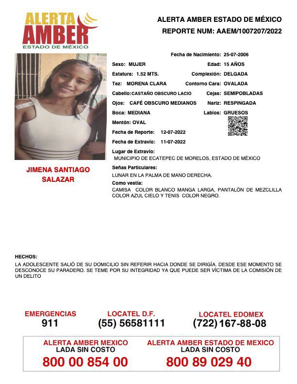 La Fiscalía General de Justicia del Estado de México (FGJEM) informó que Jimena Santiago Salazar fue localizada en Chimalhuacán y se encuentra con sus familiares en buen estado de salud, será trasladada ante el Agente del Ministerio Público para su certificación.