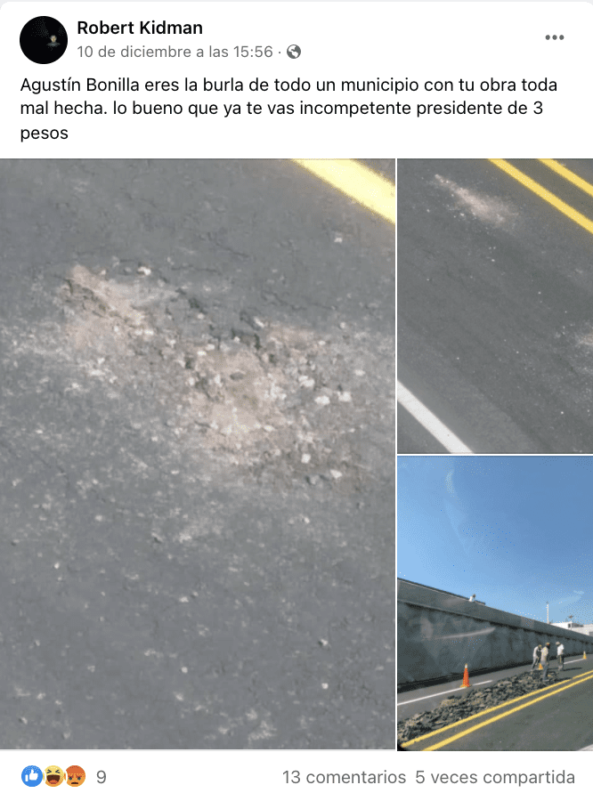 «Vecinos de la cabecera nos solicitaron que publicáramos está fotografía [sic], extrañados de que estén levantando parte de la carpeta del puente deprimido inaugurado hoy«, publicó un periódico local el 10 de diciembre (día de la inauguración) / Foto: Periódico Que Hay en Jilotepec