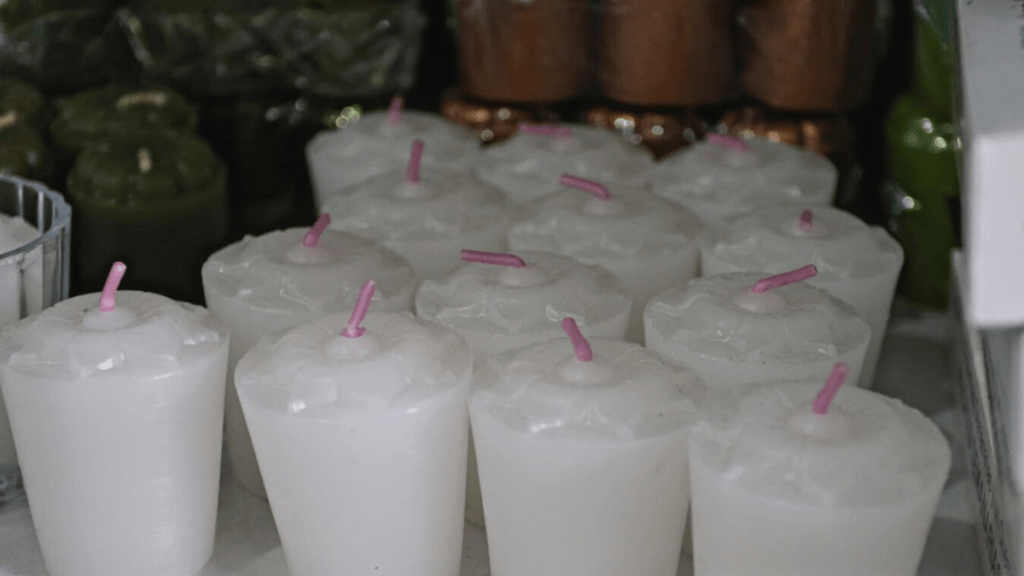 Por último, en «El Sagrado Corazón», el costo de la vela es de 70 pesos por kilo de cera. Eduardo Iniesta ofrece una presentación única: velas con una base de cera en forma de flor de cempasúchil, disponibles en diferentes colores por 40 pesos. Este diseño distintivo ha atraído a la clientela debido a su forma peculiar, que ha capturado la atención del público.