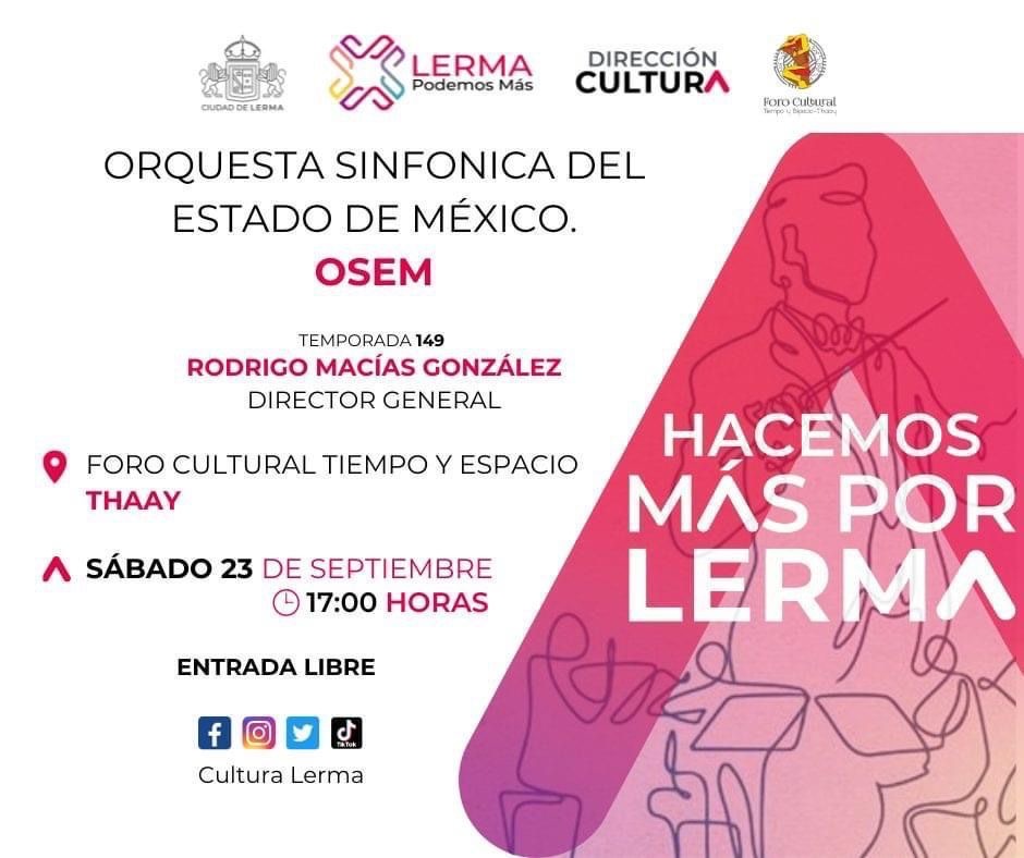 El Ayuntamiento de Lerma, liderado por Miguel Ángel Ramírez Ponce, a través de la Dirección de Cultura, invita a la ciudadanía a asistir y obtener sus boletos de entrada completamente gratuitos en la Casa de Cultura de Lerma «Profr. Adrián Ortega Monroy» y en la taquilla del teatro Thaay, de 9:00 a 18:00 horas.