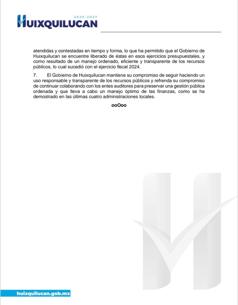 Tras la publicación de las observaciones del Órgano Superior de Fiscalización del Estado de México (OSFEM), el Ayuntamiento de Huixquilucan hizo público un comunicado para explicar su postura frente a los señalamientos. Aunque la posición oficial busca acotar el alcance de las irregularidades detectadas, AD Noticias reproduce íntegro el documento para que la ciudadanía conozca, sin intermediarios, la respuesta del gobierno municipal.