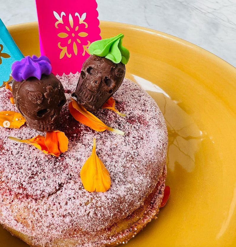 Este café-restaurante preparó pancakes de pan de muerto sabor naranja, aromatizados con azahar y rellenos de cremoso chocolate. Además, el emplatado es un mini altar con papel picado y calaveritas.