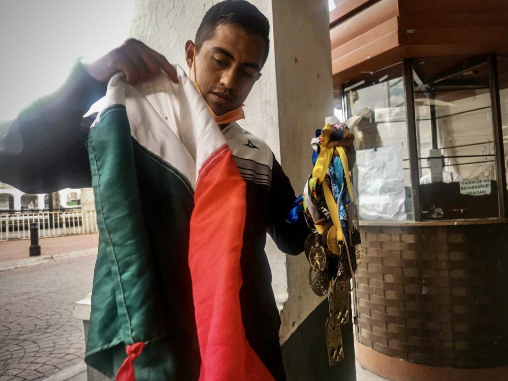 Sobre su cuello cuelgan las múltiples medallas que ha obtenido, convencido de que con su esfuerzo y el apoyo solidario de la población puede seguir su carrera deportiva, en una modalidad de Karate en la que se han establecido reglas de competencia para acomodar competiciones justas entre atletas con diferentes discapacidades.