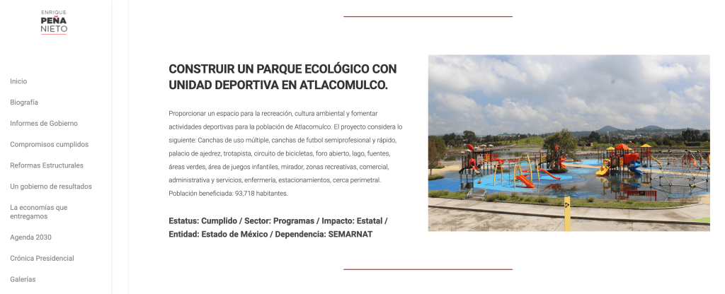 La construcción del Parque Atlacomulco fue el compromiso 173 que Peña Nieto firmó ante notario público durante su campaña en 2012. Y aunque su estatus aparece cumplido –al igual que proyectos como el Tren Interurbano México-Toluca–, la obra nunca se concluyó durante su gobierno.