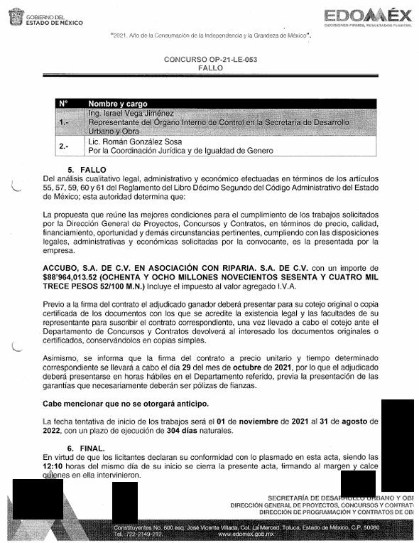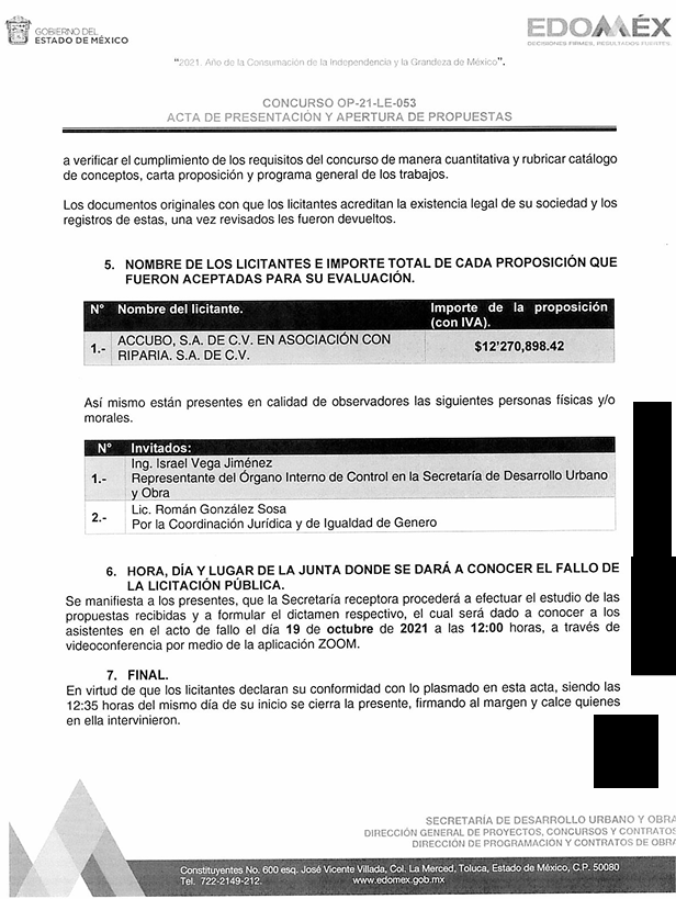 De acuerdo con las firmas del acta, las únicas personas presentes en el dictamen del fallo fueron Miguel Ángel Nieto, representante legal de Accubo y Riparia y Javier Izquierdo Lara, director general de Proyectos, Concursos y Contratos de la SEDUO.
