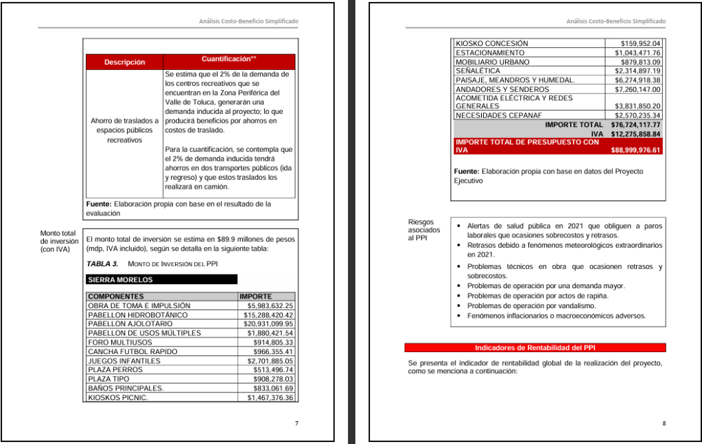 Casualmente, el costo final de la obra coincide con una estimación hecha por Javier Izquierdo un par de meses antes de la licitación. El 10 de agosto de 2021, Izquierdo redactó un análisis costo-beneficio de la obra donde estimaba que se requerirían 88 millones 999 mil pesos para rehabilitar y mejorar el parque.