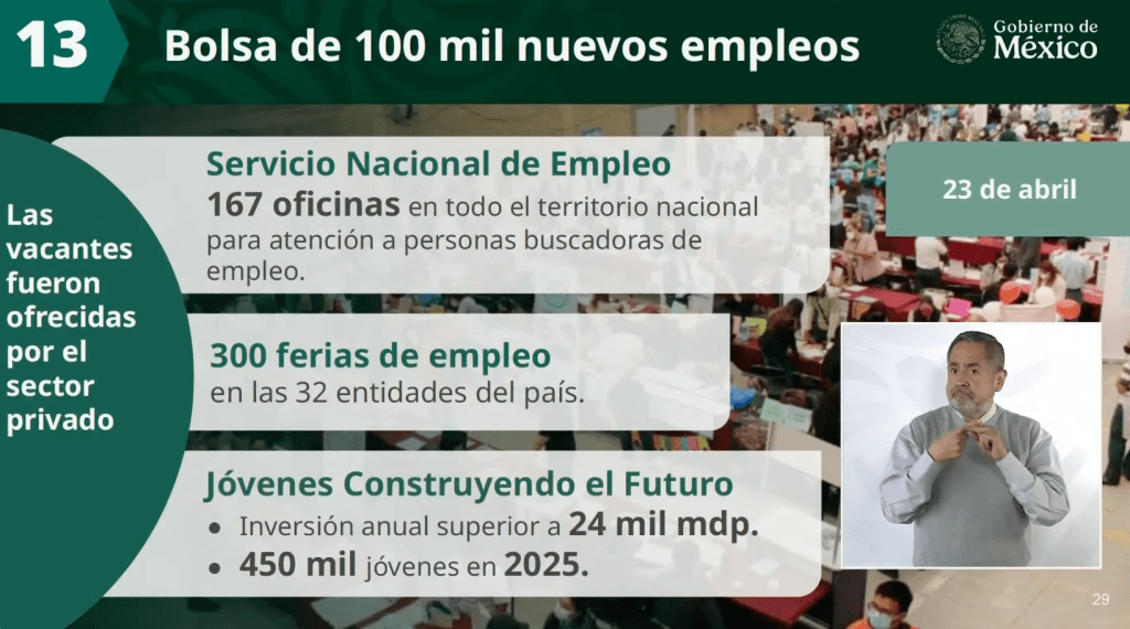 Además, se anunció la creación de 15 nuevos polos de bienestar, una ventanilla digital única para inversiones y apoyos a microempresas, cuya primera fase se anunciará el 7 de mayo.