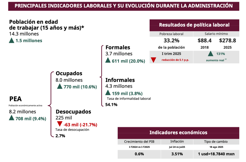 Las estadísticas laborales también reflejan una recuperación: la Población Económicamente Activa (PEA) creció 9.4% y alcanzó 8.2 millones de personas, con 770 mil ocupados más y 63 mil desempleados menos.