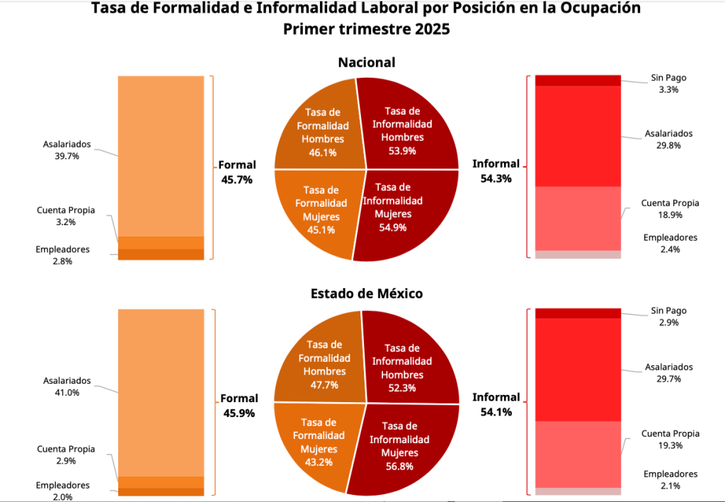 Pero el avance tiene un límite. Más de la mitad de los trabajadores en Edomex (54.1%) sigue en la informalidad: sin seguridad social, sin derechos laborales y con ingresos promedio muy por debajo de los formales. Mientras un hombre asalariado formal gana 13 519 pesos mensuales, uno informal apenas llega a 8 691. En el caso de las mujeres, la brecha es aún más amplia: 11 653 frente a 6 146 pesos.