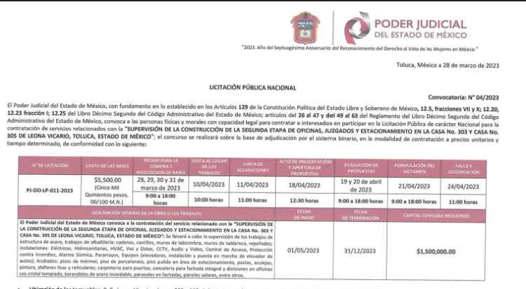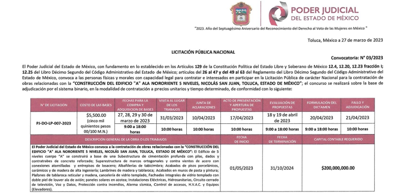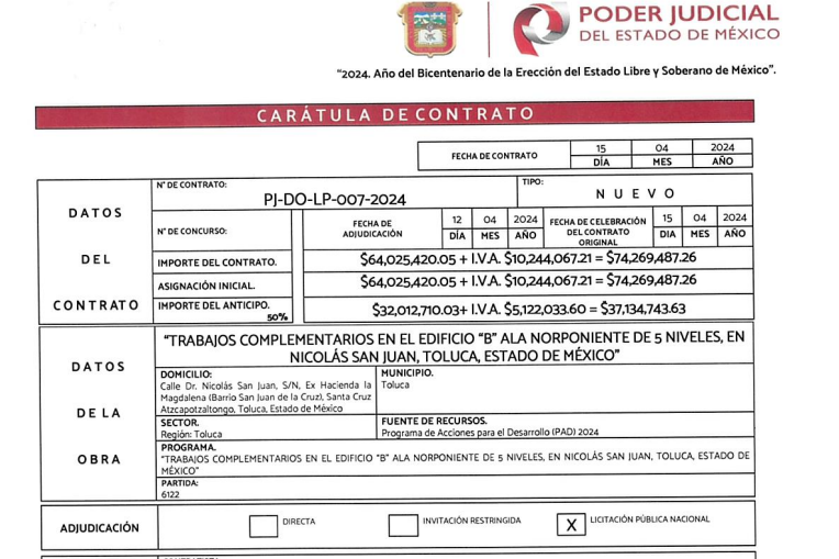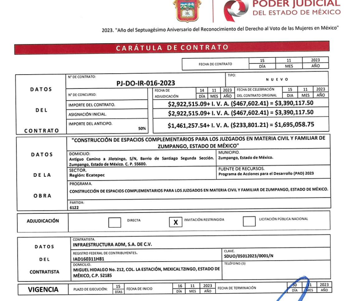 En 2023, bajo la licitación PJ-DO-IR-016-2023 y el concepto de “construcción de espacios complementarios para los juzgados en materia civil y familiar de Zumpango, Edomex”, se destinaron $3,390,117.50 pesos. Estos recursos también provinieron del Programa de Apoyo a la Infraestructura (PAD) 2023.