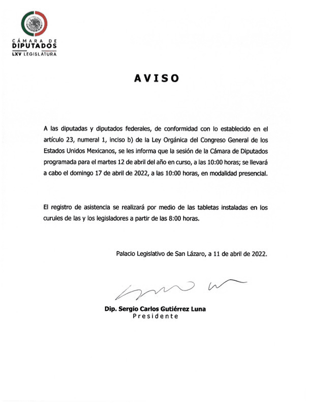 La discusión del dictamen relativo a la Reforma Eléctrica se pospuso para el próximo domingo 17 de abril a partir de las 10:00 hrs. Esto lo confirmó el presidente de la Mesa Directiva de la Cámara de Diputados, Sergio Gutiérrez Luna. Coordinadores de Morena, PT y PVEM avalaron el cambio.