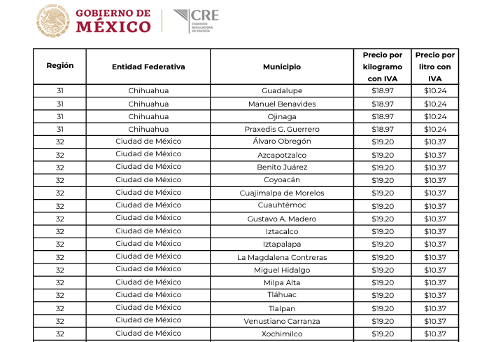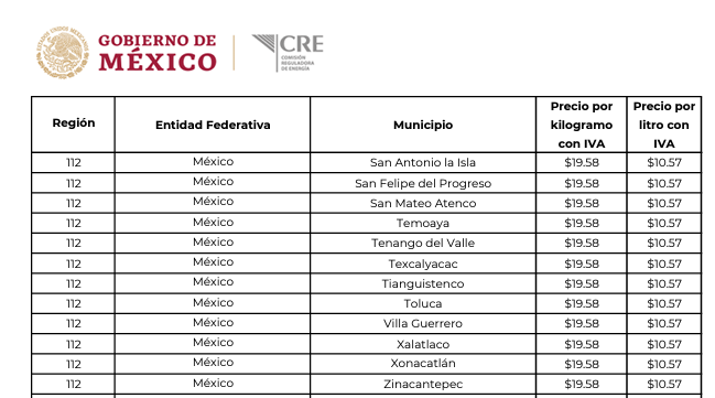 La Comisión Reguladora de Energía (CRE) publicó los precios máximos del gas LP para la semana del 3 al 9 de marzo de 2024.