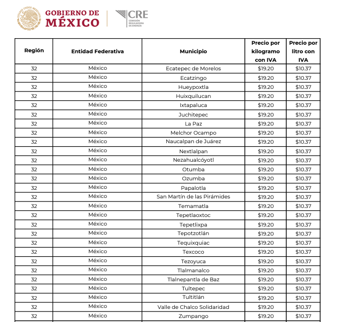 En Toluca, capital del Estado de México (Edomex), el precio por kilogramo de gas LP será de $19.58 pesos, representando una reducción de 23 centavos en comparación con la semana anterior. El costo por litro será de $10.57 pesos, mostrando una disminución de 13 centavos en la misma comparación.