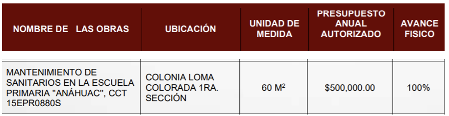 En la lista de obras realizadas con este fondo se menciona la construcción de una barda perimetral en la escuela Primaria Anáhuac, de la colonia Loma Colorada, con una inversión de 900 mil pesos. El mantenimiento de sanitarios en la misma escuela, con un gasto de 500 mil pesos. Y la construcción de techado en el patio de la Secundaria Benemérito de las Américas, en Ciudad Satélite, con un monto destinado de un millón 300 mil pesos.