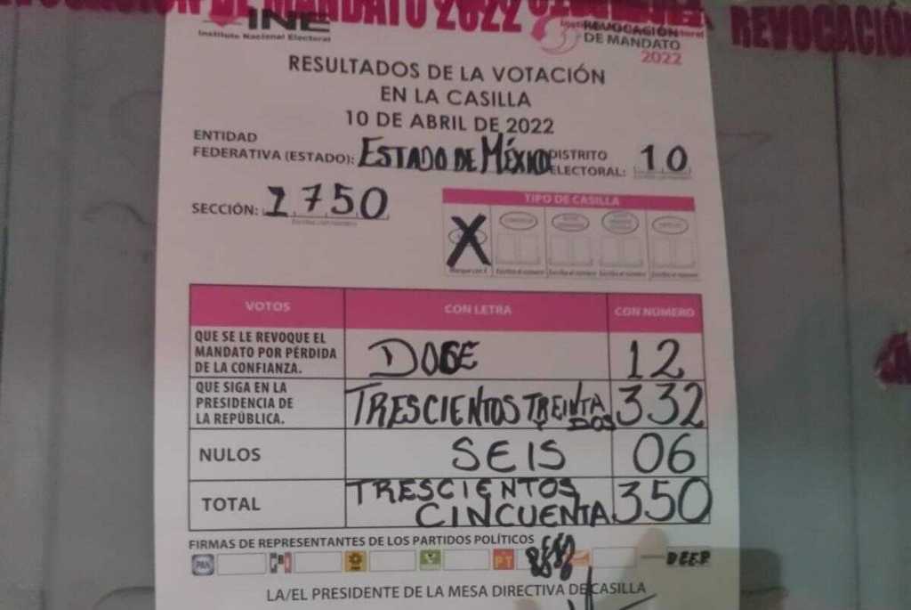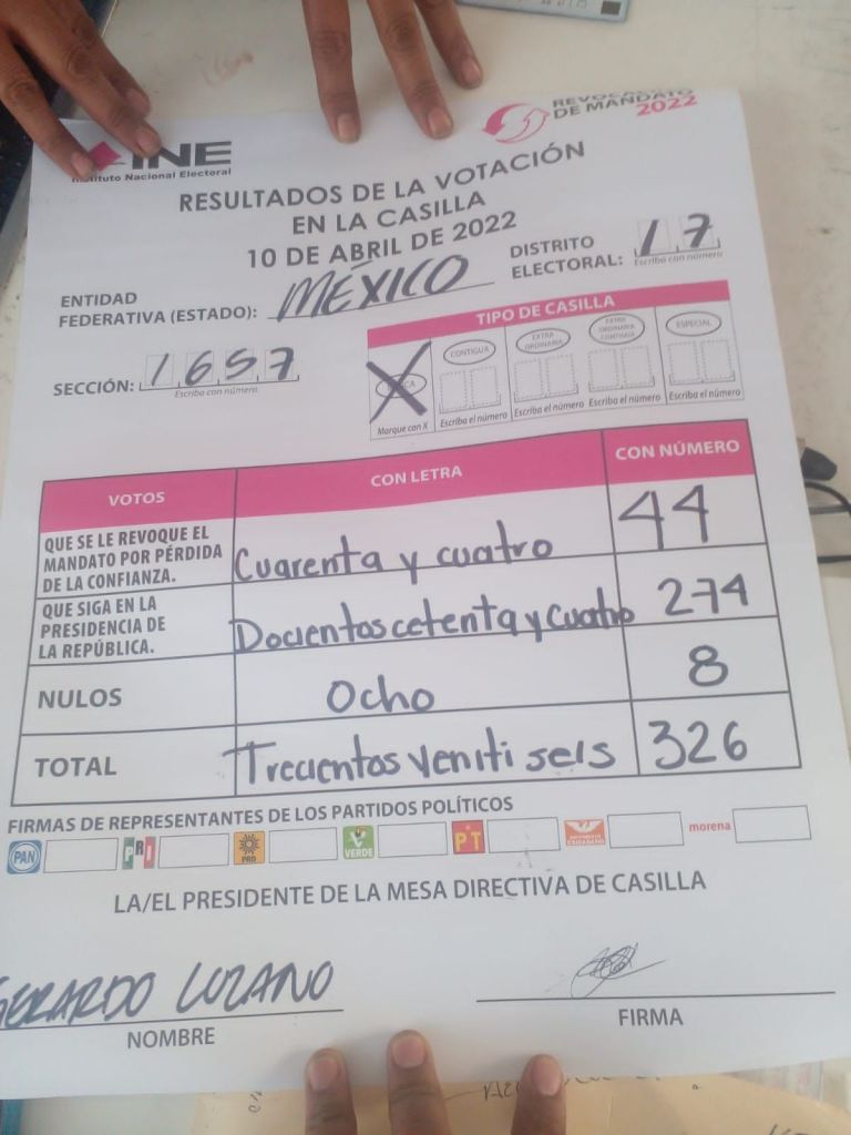Algunas casillas ya contabilizadas muestran los siguientes resultados: Sección 1908 con 329 votos a favor de la ratificación de mandato, 35 por la revocación y 11 nulos para un total de 375 votos.