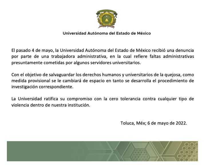 Ante la denuncia, este medio buscó la posición de la UAEMex y a través de su área de comunicación, la universidad explicó que hasta el momento no ha recibido un documento por parte de la Fiscalía que acredite la denuncia. Sin embargo, reconoció que existe un antecedente del caso donde se le orientó a la afectada cómo presentar una denuncia formal.