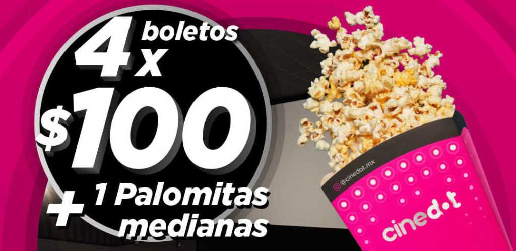 4 entradas por 100 pesos en diversas salas y una canasta de palomitas chicas, gratis ,mostrando tu dedo marcado y tu INE.