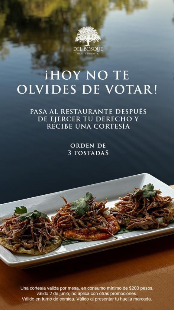 Ensaladas, sopas, tacos, gringas, alambres y más hay en este restaurante, para hacerte acreedor del 15 por ciento de descuento en tu consumo deberás tomarte una foto y etiquetarlos, obviamente deberás tener tu dedo marcado con tinta de que fuiste a votar.