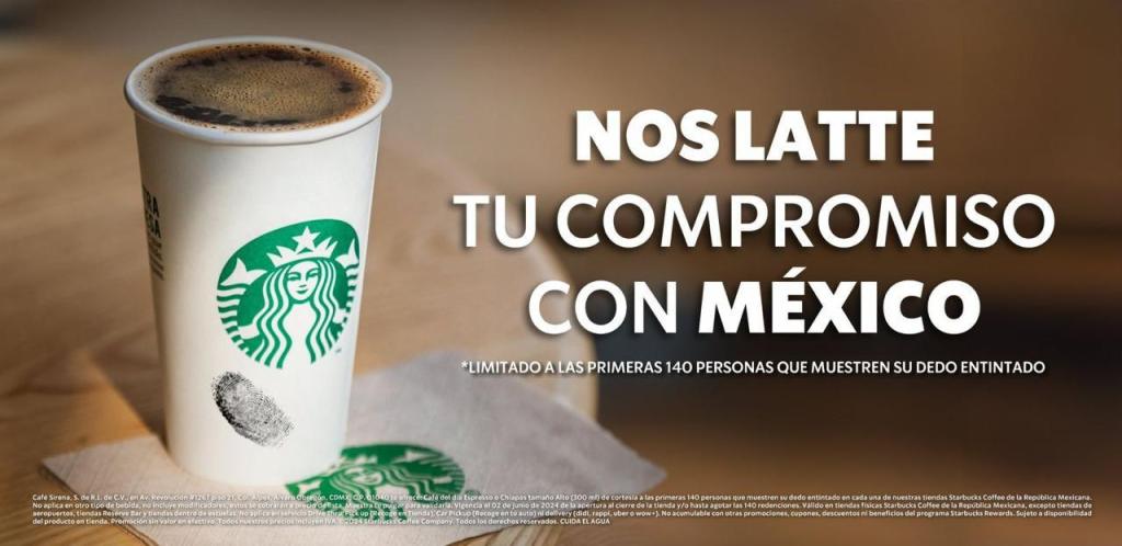 Campaña «Nos Latte tu compromiso con México». Presenta tu dedo marcado y recibe un café del día tamaño alto gratis. Aplica en todas las sucursales, excepto aeropuertos, universidades, Starbucks, Reserve Bar, Drive Thru, Pick Up, Car Pickup, y delivery.