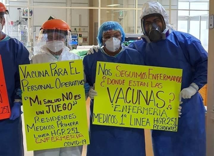 Médicos y enfermeras publicaron en sus redes sociales los mensajes escritos en las pancartas, nos seguimos enfermando, “¿dónde están las vacunas?”, “mi salud no es un juego”, reclamaron los trabajadores.