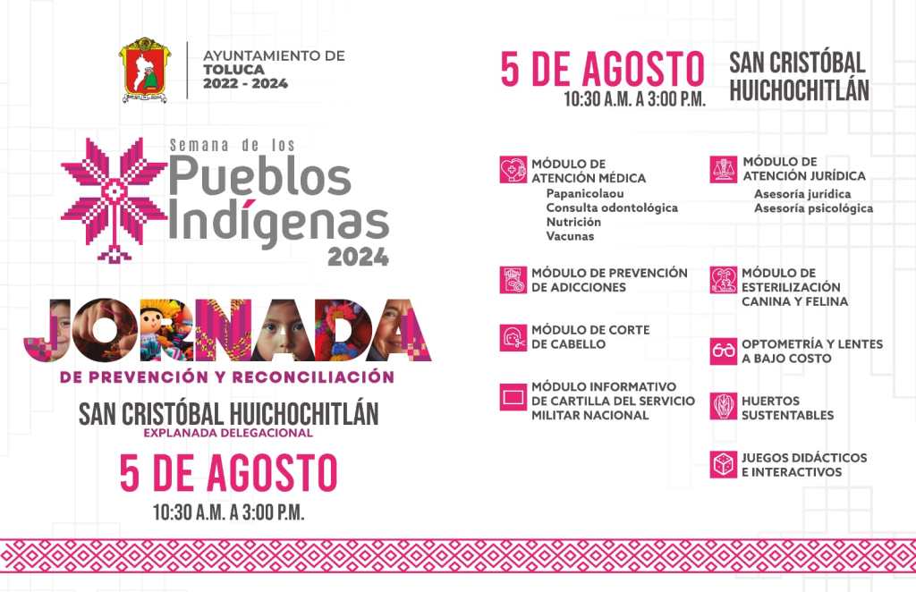 Toluca tendrá una Jornada de Prevención y Reconciliación con motivo de la Semana de los Pueblos Indígenas 2024. Contará con una serie de servicios y actividades diseñadas para promover la salud de la población.