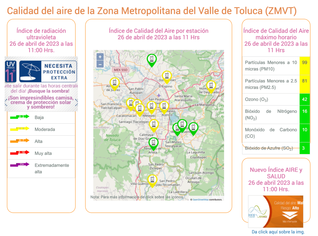 La zona metropolitana del Valle de Toluca presenta niveles de radiación ultravioleta extremadamente altos este 26 de abril. De acuerdo con la Red Automática de Monitoreo Atmosférico de la Zona Metropolitana, los índices se sitúan a más de 11.