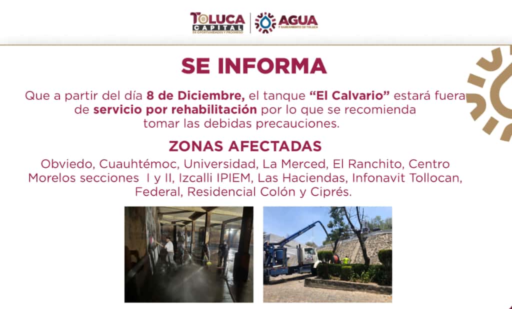 El municipio informó que podría haber afectaciones temporales en: José María Oviedo, Cuauhtémoc, Universidad, La Merced, El Ranchito, Centro, Morelos Primera y Segunda Sección, Izcalli IPIEM, Las Haciendas, Infonavit Tollocan, Federal, Residencial Colón y Ciprés.