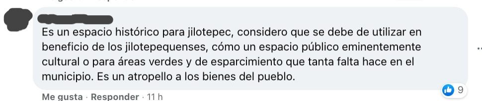 “También lo dejo claro: Si me gustaría que en este espacio dadas las condiciones actuales del municipio, se convirtiera en un NUEVO ESPACIO PÚBLICO al servicio de TODOS LOS JILOTEPEQUENSES, que ayude a dar agilidad al terrible TRÁFICO QUE SE GENERA A DIARIO, que de una RENOVADA IMAGEN URBANA CON NUEVAS ÁREAS VERDES y que ayude al crecimiento económico de NUESTROS comerciantes. UN NUEVO ESPACIO PÚBLICO PARA EL ESPARCIMIENTO DE NUESTRA GENTE y NO para un particular.