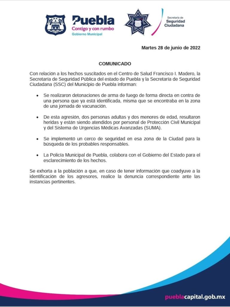 Esta mañana se registró una balacera a las afueras de un Centro de Salud en Puebla, durante la jornada de vacunación contra Covid-19 para menores de 5 a 11 años. Cuatro personas resultaron heridas, entre ellas, dos niños.