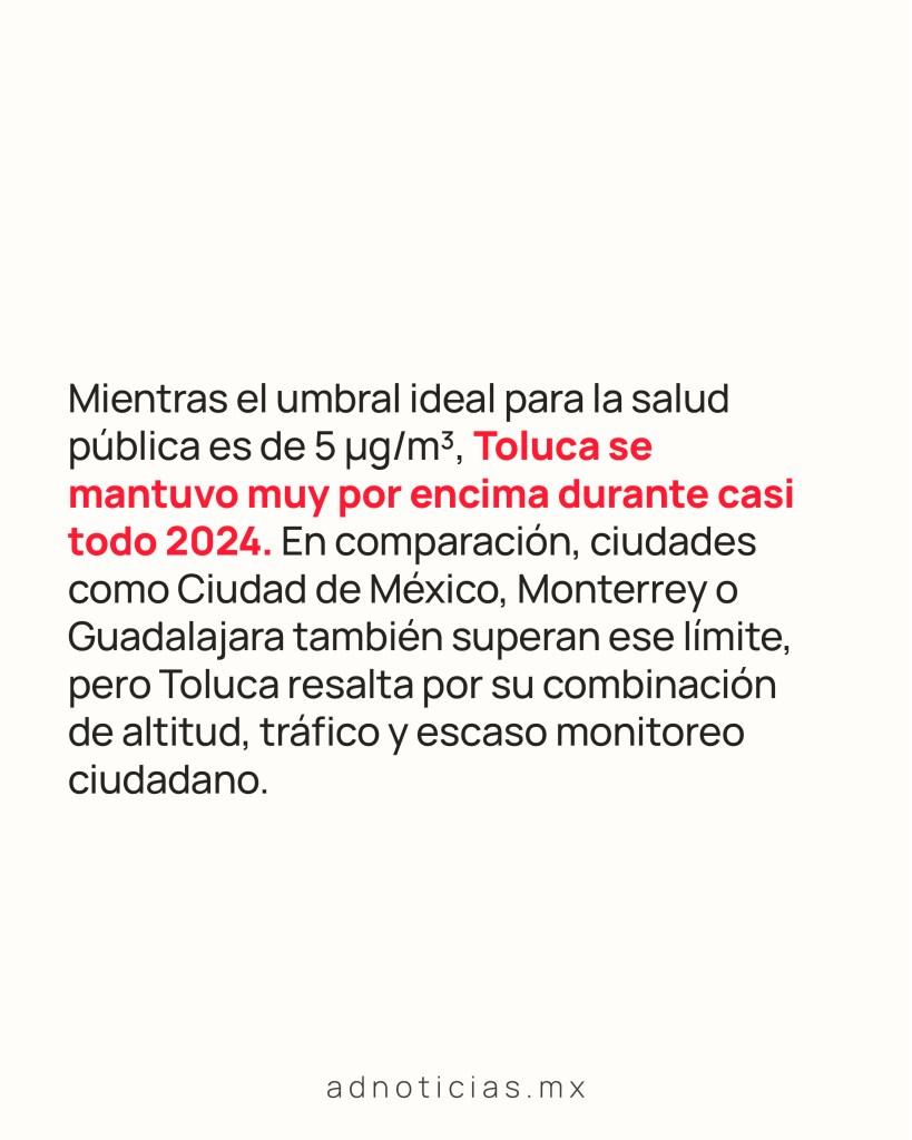 Mientras el umbral ideal para la salud pública es de 5 µg/m³, Toluca se mantuvo muy por encima durante casi todo 2024. En comparación, ciudades como Ciudad de México, Monterrey o Guadalajara también superan ese límite, pero Toluca resalta por su combinación de altitud, tráfico y escaso monitoreo ciudadano.