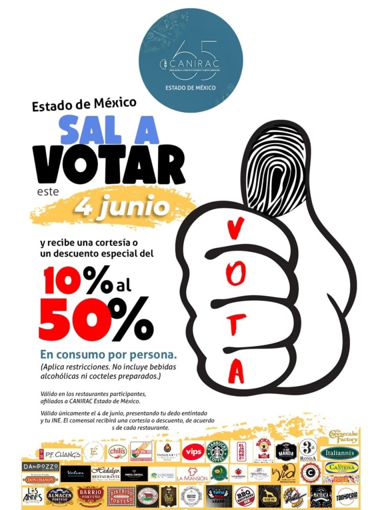La Cámara Nacional de la Industria de Restaurantes y Alimentos Condimentados (CANIRAC) anunció que varios de sus afiliados darán descuentos a los comensales que hayan votado en las elecciones del 4 de junio en el Estado de México (Edomex).