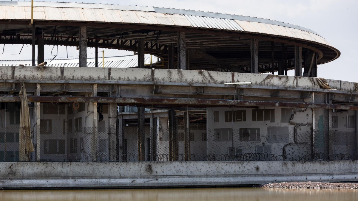 La base quedó expuesta otra vez: columnas corroídas, paneles agrietados, alambres de púas oxidados que cuelgan flojos a lo largo del perímetro. El agua sigue allí, quieta, como si lamiera los cimientos. No avanza ni retrocede con dramatismo; simplemente ocupa el espacio que el lago siempre reclamó.