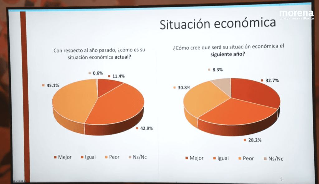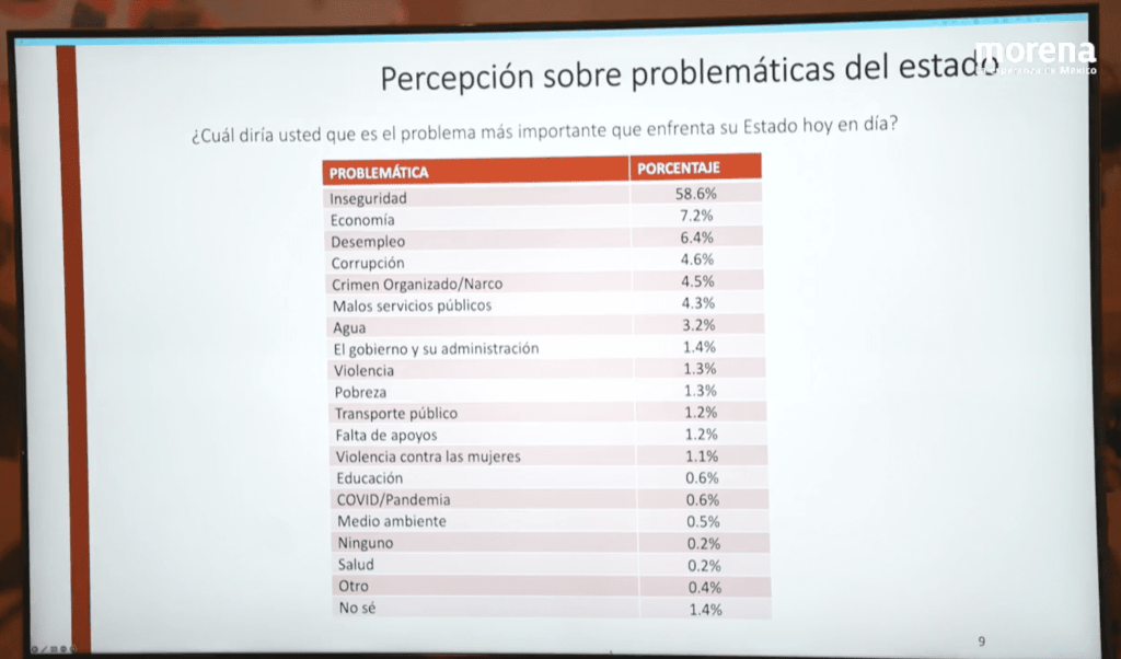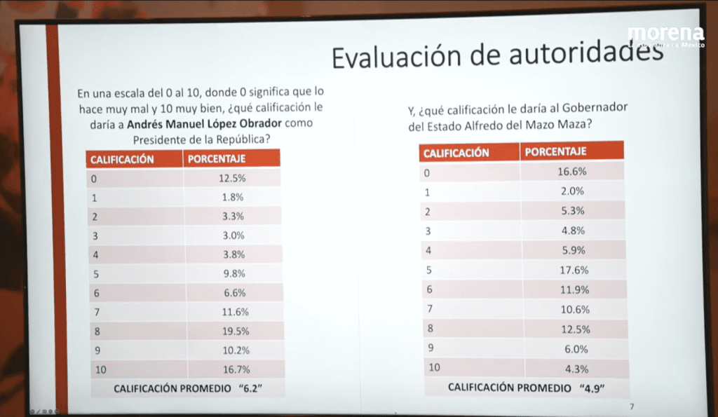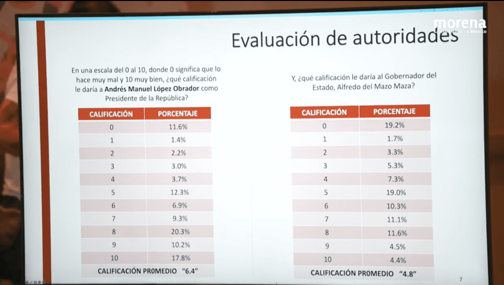 La diputada de Morena, Ivonne Cisneros –perteneciente a la Comisión de Encuestas– expuso que se trató de una encuesta telefónica, con una muestra robusta de 1200 llamadas efectivas; en la que se midió el interés en política y percepción de la situación económica, la evaluación e autoridades, percepción sobre problemáticas de Estado, intención de voto por partido y el reconocimiento de aspirantes.