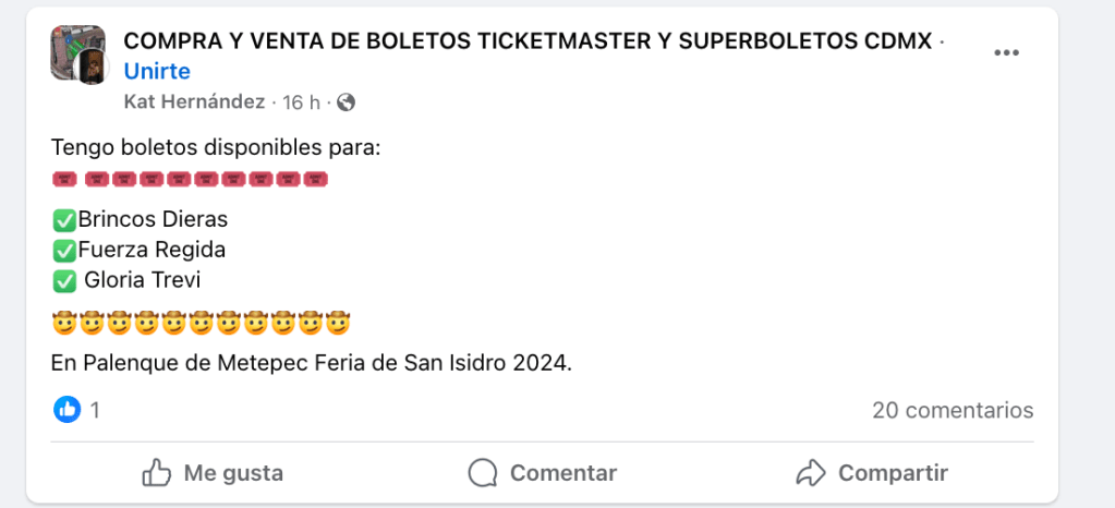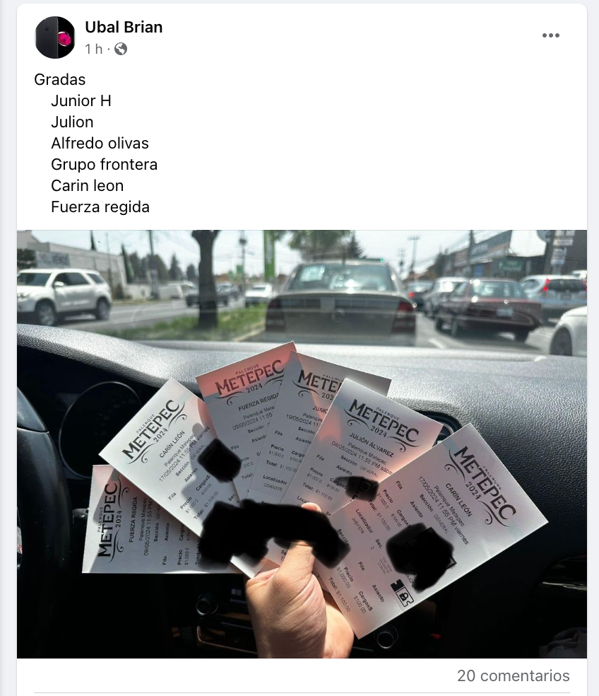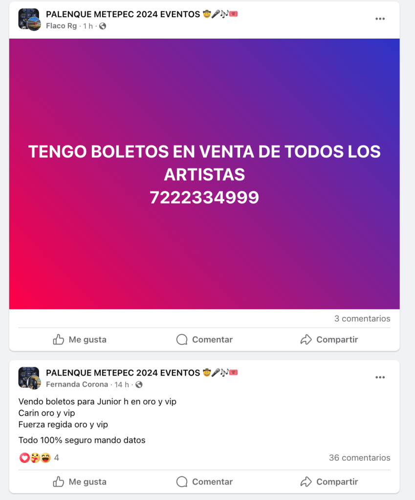 Como cada año, se ha identificado la reventa de boletos para los eventos programados en el Palenque de Metepec 2024 en diversas páginas de Facebook. Bajo la aseveración de «Tenemos del artista que guste», usuarios han ofrecido boletos para los espectáculos, generando alerta entre los organizadores y la comunidad de asistentes.