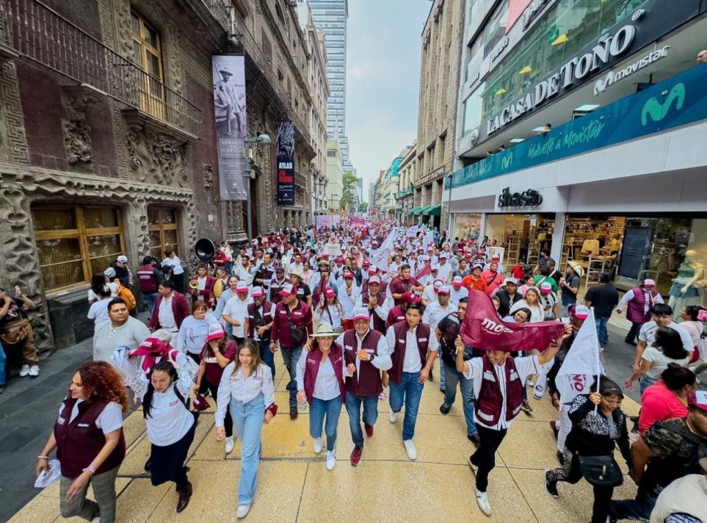 Ricardo Moreno Bastida tomó de las manos a su familia y avanzó por las principales calles del centro histórico de la ciudad, moviéndose al ritmo de la música, en una verdadera verbena y rodeado de banderines de color blanco y guinda de Morena.