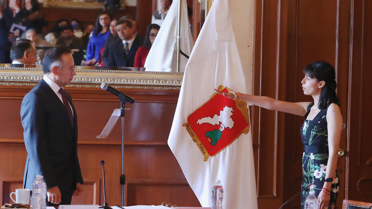 El alcalde de Toluca, Raymundo Martínez Carbajal tomó la protesta a Yustine Maramay Cruz Hernández como sexta regidora suplente del cabildo municipal, quien sustituirá a la priista Mariela Mora por la licencia temporal que solicitó el pasado 4 de mayo.