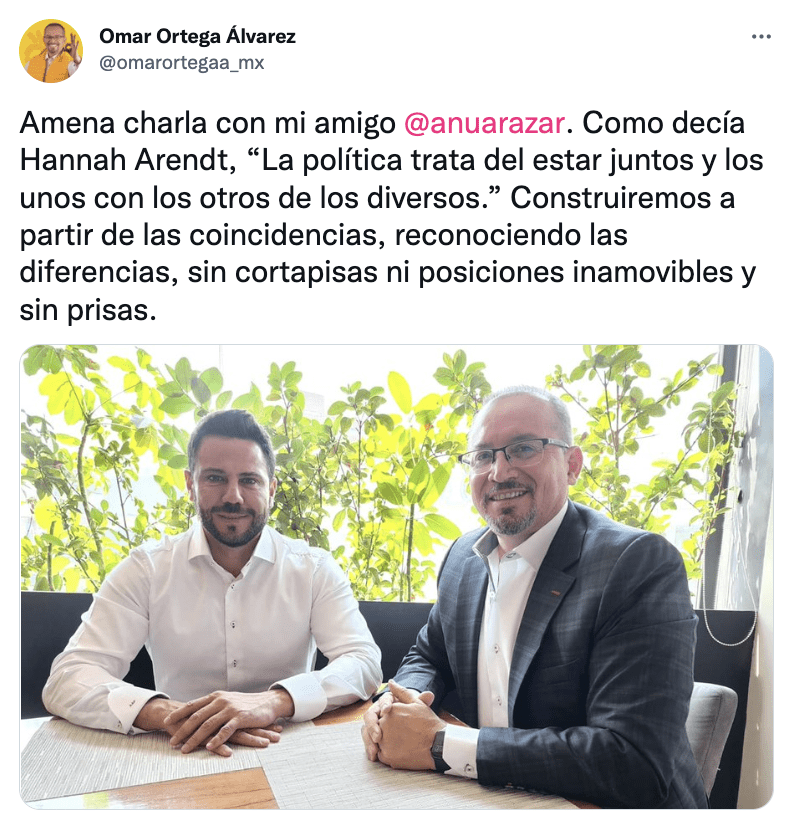 Luego de sus declaraciones, el coordinador de los diputados del PRD compartió una fotografía dialogando con Anuar Azar, presidente del PAN en el Edomex, quien ya habría asegurado que “La alianza electoral entre el Partido Acción Nacional, Revolucionario Institucional y PRD, va, solo que esta debe ser encabezada por la candidata o candidato mejor posicionado en el Estado de México, y que garantice el triunfo”.