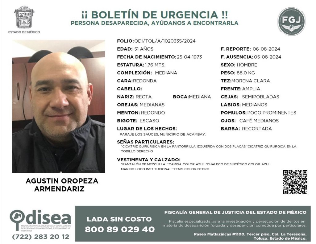 Esta detención ocurre pocos días después de la desaparición de Agustín Oropeza Armendáriz, director de Seguridad Pública de Temascalcingo, y del elemento Juan Carlos Zaldívar Zaldívar, quienes fueron vistos por última vez en Acambay el pasado lunes.