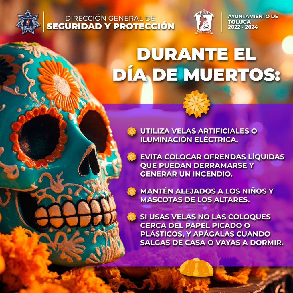 Con la llegada de Día de Muertos, la Coordinación de Protección Civil y Bomberos de Toluca, junto con la Coordinación General de Protección Civil y Gestión Integral del Riesgo, hacen un llamado a la ciudadanía para seguir recomendaciones y medidas de seguridad, tanto en hogares como en espacios públicos.