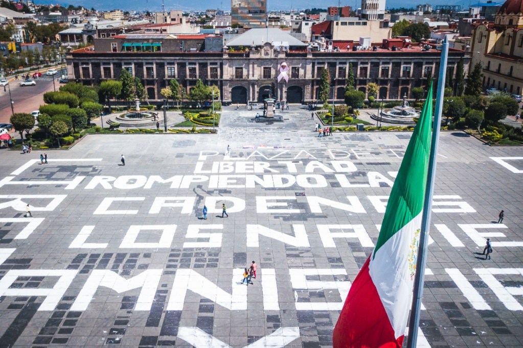 Miembros del colectivo Haz Valer mi Libertad se manifestaron con pintas sobre la plancha de la Plaza de los Mártires, en el centro de Toluca, para exigir Amnistía.