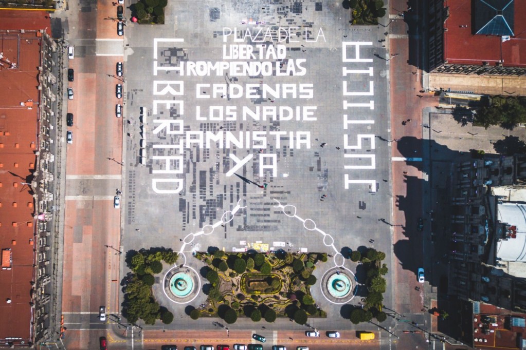 Sobre la explanada de este zócalo quedó inscrita la leyenda “Plaza de la libertad, rompiendo las cadenas de los nadie ¡Amnistía ya!” junto a la figura de dos cadenas rotas y enmarcada por las palabras libertad y justicia, esta sería la tercera ocasión en la que los manifestantes intervienen este espacio.