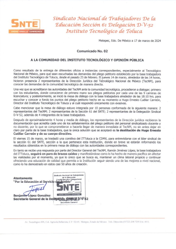 El Sindicato Nacional de Trabajadores de la Educación, Sección 61, informó que, como respuesta a las demandas de maestros, administrativos y alumnos del Instituto Tecnológico de Toluca, el 14 de marzo, dos representantes de la Dirección Jurídica dialogaron con estudiantes y maestros para conocer sus demandas.