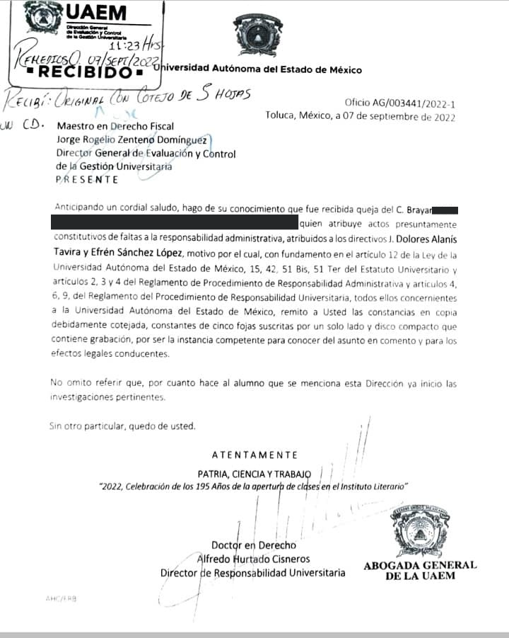 De igual forma –como hizo público este medio– el consejero universitario presentó una queja ante la Comisión de Derechos Humanos del Estado de México, señalando al director J. Dolores Alanís Tavira y al entonces subdirector académico, Efrén Sánchez López por intimidarlo.