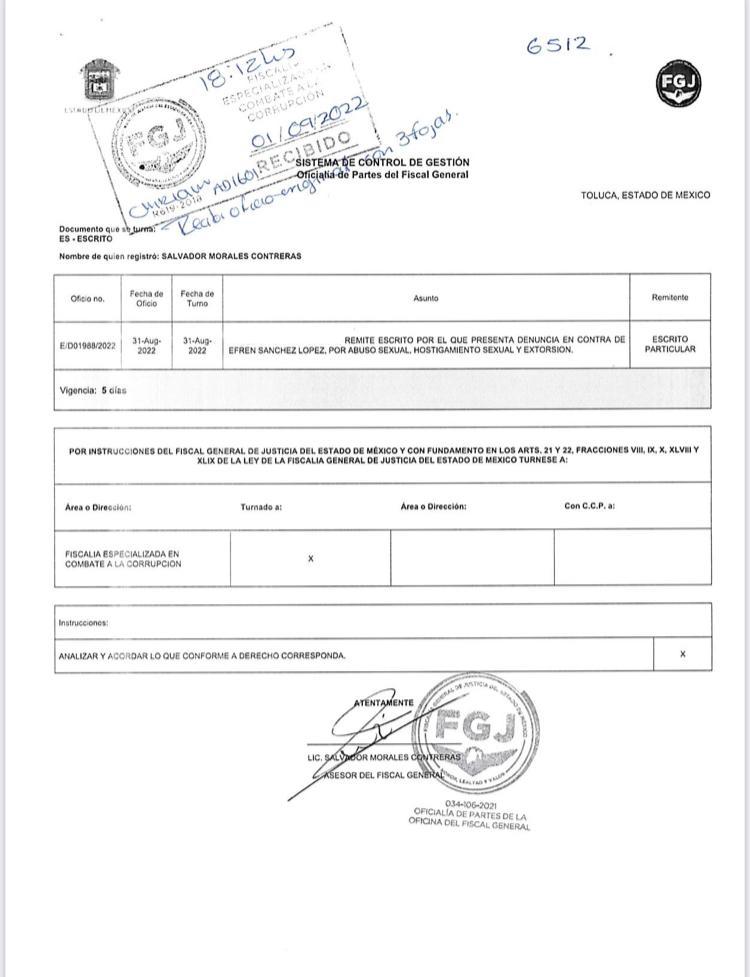 La Fiscalía mexiquense fue notificada de las denuncias los días 26 de agosto y 31 de agosto de este año.