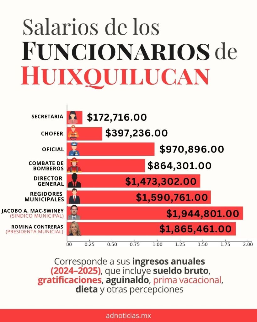 En Huixquilucan, la disparidad salarial entre los distintos niveles del Ayuntamiento es pronunciada. Mientras las figuras políticas reciben sueldos cercanos a los dos millones de pesos anuales, otros trabajadores públicos perciben cifras significativamente menores: el comandante de bomberos gana un total anual de aproximadamente 864 mil pesos; un oficial, cerca de 970 mil pesos; y un chofer, alrededor de 397 mil pesos al año. Los directores generales reciben 1.47 millones. Para contrastar, el ingreso promedio anual de un habitante de Huixquilucan ronda los 134 mil pesos, según datos de la Secretaría del Bienestar.
