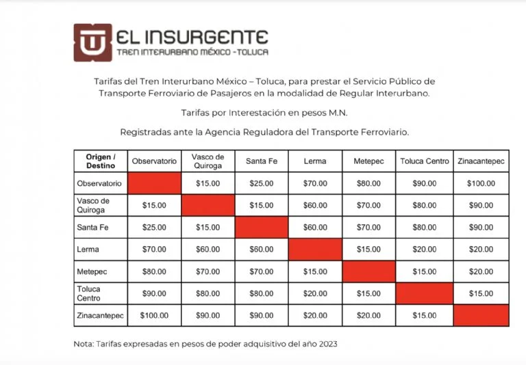 La Agencia Reguladora del Transporte Ferroviario (ARTF) aprobó las tarifas del Tren Interurbano México-Toluca «El Insurgente».