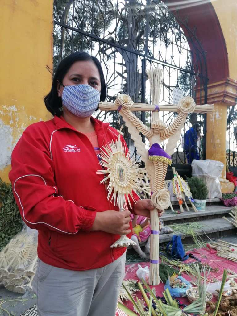 Desde los seis años, la señora Ariana Peña Sánchez aprendió a tejer la palma verde y seca, al paso del tiempo ya diseñaba sus propias cruces y ramos, y es que esta actividad la heredó de sus abuelos y padres quienes son originarios de Zinacantepec y San Cristóbal Huichochitlán.